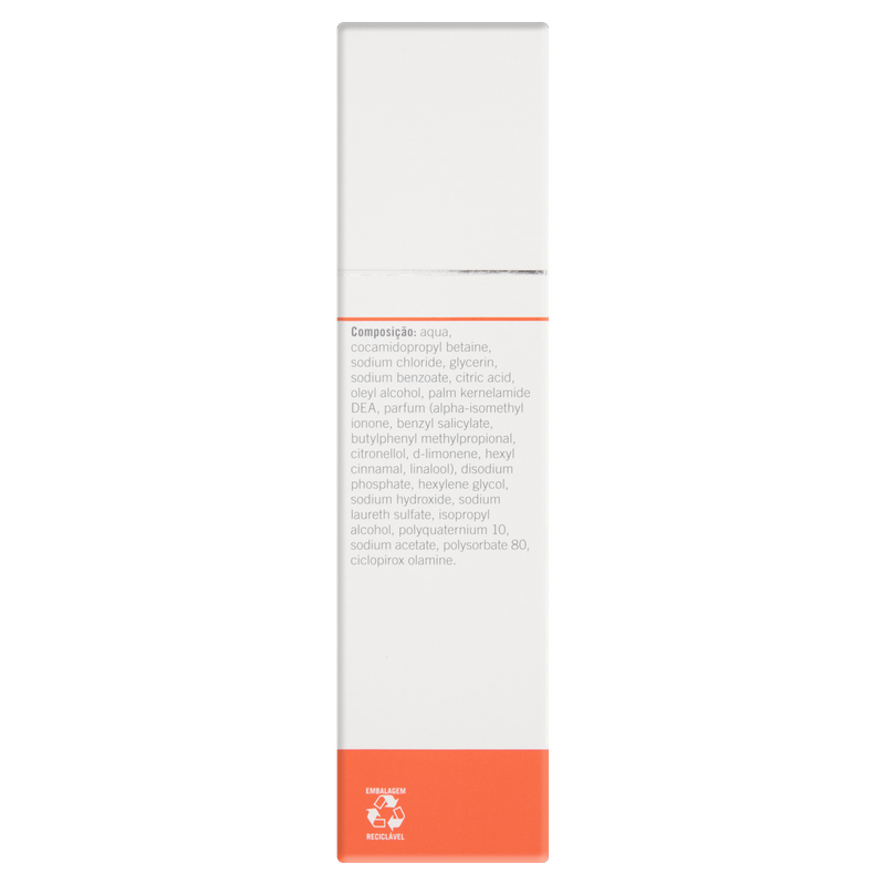 Composição: Aqua cocamidopropyl betaine, sodium chloride, glycerin, sodium benzoate, citric acid, oleyl alcohol, palm kernelamide DEA, parfum (alpha-isomethyl ionone, benzyl salicylate, butylphenyl methylpropional, citronellol, d-limonene, hexyl cinnamal, linalool), disodium phosphate, hexylene glycol, sodium hydroxide, sodium laureth sulfate, isopropyl alcohol, polyquaternium 10, sodium acetate, polysorbate 80, ciclopirox olamine.