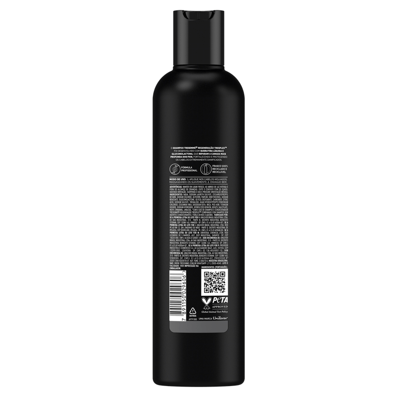 Por isso, inspirado na última tendência de salão, desenvolveu o novo Shampoo TRESemmé TRESplex Regeneração, ideal para quem deseja regenerar os cabelos após danos causados pelo calor do secador, da chapinha e até mesmo dos processos químicos mais agressivos como a tintura e descoloração. Ele foi profissionalmente desenvolvido com Fórmula Micelar que, por meio de moléculas inteligentes, remove as impurezas de maneira delicada e eficaz, sem agredir a estrutura dos fios. O mais poderoso tratamento de TRESemmé foi desenvolvido com a exclusiva tecnologia TRESplex que age no interior da fibra capilar reforçando as proteínas que formam a estrutura dos fios em um simples e inovador tratamento para uso contínuo em casa para ter cabelos 10x mais fortes e regenerados. Pode ser usado todos os dias e é indicado para cabelos extremamente danificados.