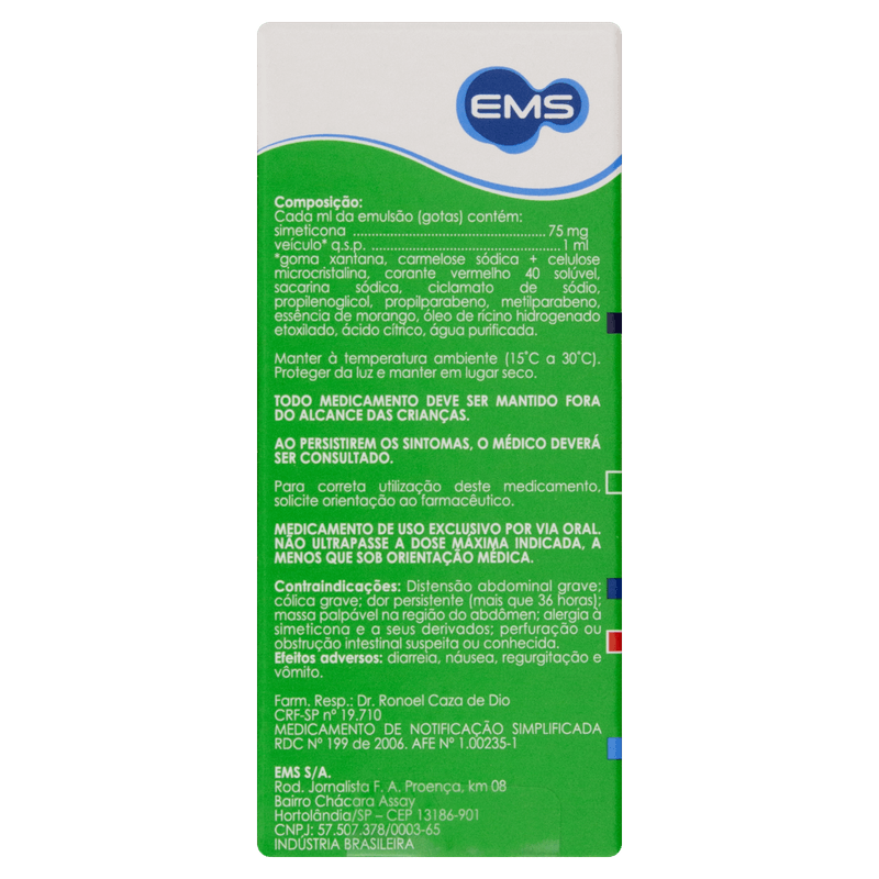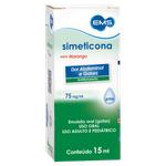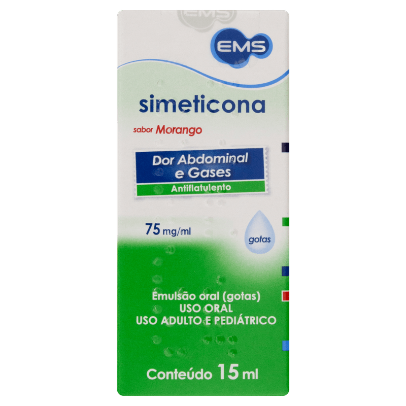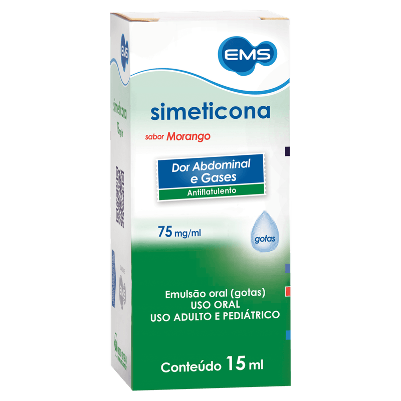 Simeticona 75mg Emulsão Oral 15ml - Genérico EMS é um medicamento antiflatulento indicado para o alívio rápido do excesso de gases no aparelho digestivo, como flatulência, estufamento, desconforto e dores abdominais. Sua fórmula contém 75 mg de simeticona por mililitro, que atua reduzindo a tensão superficial dos líquidos digestivos, facilitando a eliminação dos gases ao romper as bolhas formadas. Ideal para adultos e crianças, também pode ser usado como auxiliar na preparação para exames médicos como endoscopia e colonoscopia.
