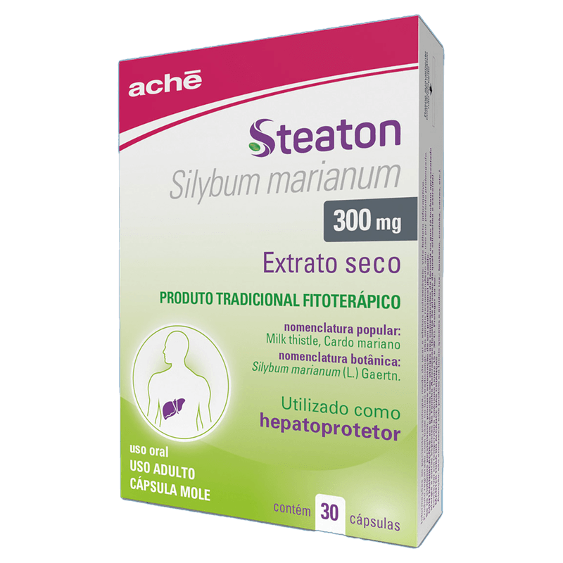 O Steaton Silimarina Aché 300mg é um suplemento hepatoprotetor em cápsulas moles, formulado com extrato seco de Silybum Marianum, conhecido popularmente como Cardo Mariano ou Milk Thistle. Indicado para adultos que buscam auxiliar na proteção e regeneração do fígado, este produto promove a desintoxicação do organismo, melhora a função hepática e possui ação antioxidante, estabilizadora da membrana celular, antifibrótica e colagoga. Seu uso regular contribui para a regeneração celular hepática, favorecendo a saúde do fígado de forma natural.