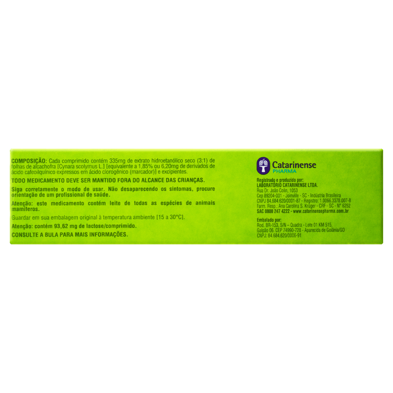Composição: 335mg de extrato seco de alcachofra, celulose microcristalina e estearato de magnésio. Apresenta textura em comprimido revestido, sem sabor, facilitando a administração. Registro MS nº 1234567890. Produto fitoterápico para distúrbios do fígado e vias biliares, ideal para quem busca suporte natural para a digestão e saúde hepática.