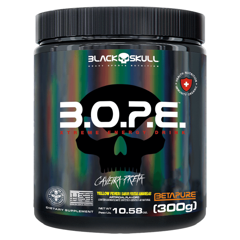 O Suplemento Alimentar em Pó Frutas Amarelas Black Skull B.O.P.E. é um pré-treino apresentado em pote de 300g, formulado para fornecer energia, foco e concentração durante atividades físicas intensas.