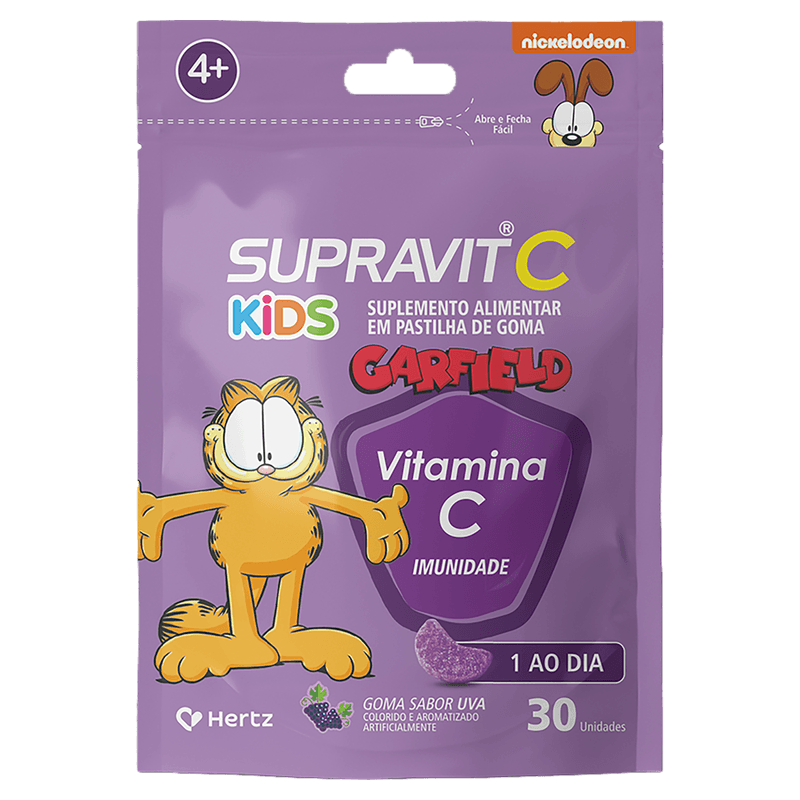 Cada embalagem contém 30 gomas com textura mastigável, facilitando a administração oral. Supravit C Kids atua diretamente no fortalecimento da imunidade infantil, com ingredientes que suportam o desenvolvimento saudável. Produto de venda livre, indicado para crianças a partir de 4 anos, que não substitui uma alimentação equilibrada e deve ser consumido com orientação de nutricionista ou médico.