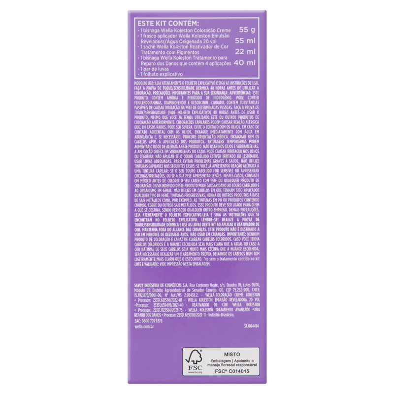 Modo de usar: Siga as instruções do folheto explicativo incluso no kit. Realize a prova de toque/sensibilidade 48 horas antes da aplicação. Misture a bisnaga de coloração com a emulsão reveladora e aplique nos cabelos secos e não lavados, distribuindo uniformemente. Após o tempo de pausa indicado, enxágue bem e aplique o Tratamento Gloss Intenso para finalizar. Use luvas durante a aplicação e evite contato com os olhos.