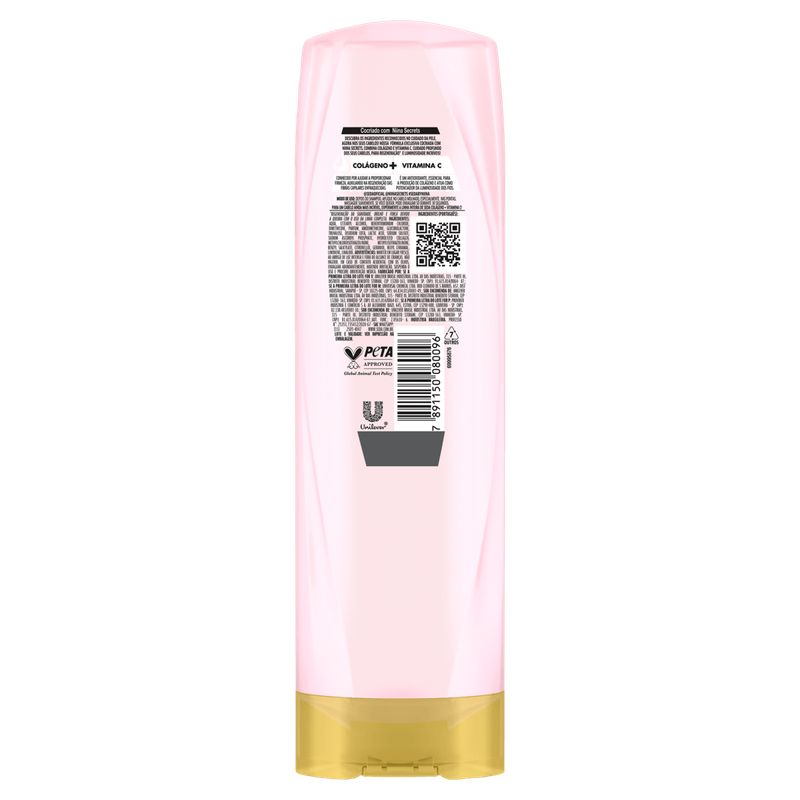 ComposiçãoAqua, cetearyl alcohol, behentrimonium chloride, dimethicone, parfum, amodimethicone, gluconolactone, trehalose, disodium EDTA, lactic acid, sodium sulfate, sodium ascorbyl phosphate, hydrolyzed collagen, methylchloroisothiazolinone, methylisothiazolinone, benzyl salicylate, citronellol, geraniol, hexyl cinnamal, limonene, linalool.