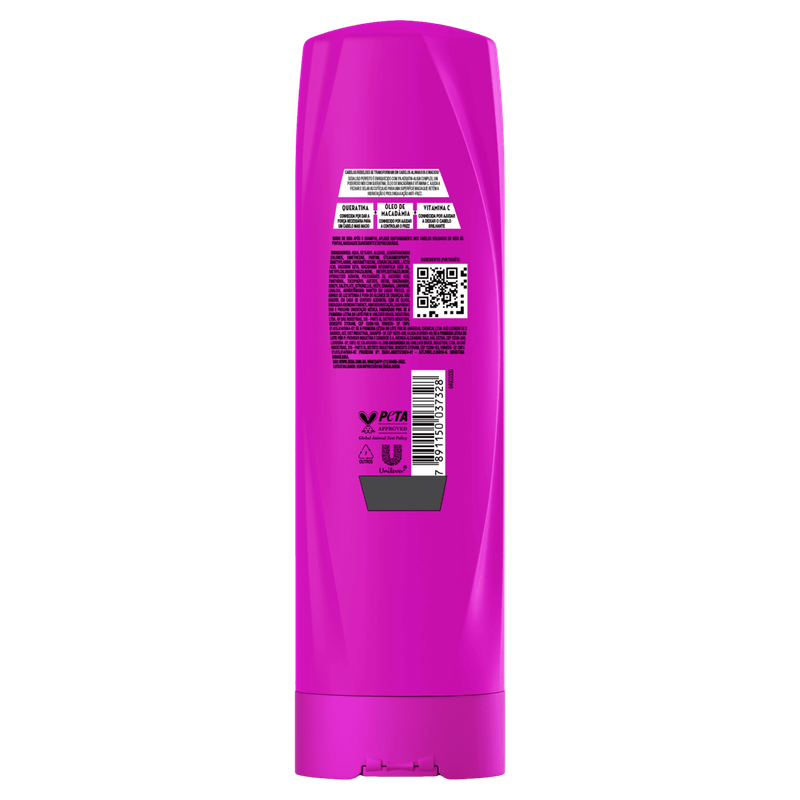 • A fórmula do tratamento condicionador contém Vitamina C, conhecida por ajudar no alinhamento dos fios, Óleo de Macadâmia, para controlar o frizz, e Proteína de Seda, com propriedades hidratantes