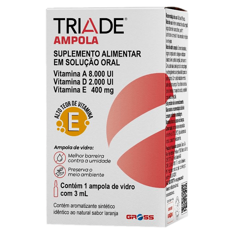 O Suplemento Oral Gross Triade Vitaminas A, D e E em ampola de 3ml sabor laranja é uma solução prática e eficaz para quem busca fortalecer a saúde óssea, imunológica, da pele e dos cabelos. Composto por vitaminas essenciais, ele auxilia na manutenção da visão, no funcionamento do sistema imune, no metabolismo do ferro e na proteção contra o envelhecimento precoce. A vitamina A atua como agente protetor ósseo e promove a reposição de colágeno, enquanto a vitamina D melhora a absorção de cálcio, a força muscular e estimula o crescimento capilar. A vitamina E, por sua vez, é um antioxidante que combate os radicais livres, prevenindo danos celulares e perda óssea.