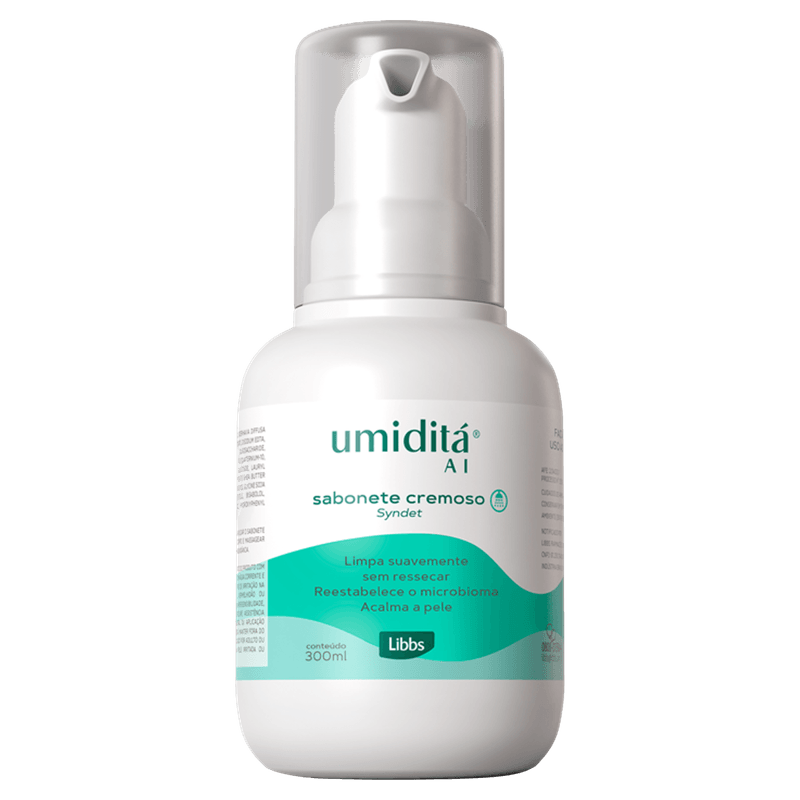 O Sabonete Líquido Cremoso Umiditá AI é um sabonete Syndet desenvolvido com tecnologia que limpa sem agredir a pele, proporcionando uma sensação de conforto e diminuindo o ressecamento após o banho. Ideal para uso adulto e infantil, pode ser aplicado tanto no rosto quanto no corpo. Sua fórmula mantém o pH fisiológico da pele e ajuda a restabelecer a barreira cutânea, equilibrando o microbioma cutâneo. Com uma cosmética em espuma cremosa à base de manteiga, o produto promove uma limpeza suave e eficaz. É hipoalergênico, oftalmologicamente testado e livre de fragrância, tornando-se uma excelente opção para peles sensíveis. Para usar, agite antes de aplicar sobre a pele úmida, massageie suavemente e enxágue em abundância. Os principais ativos incluem Symcalmin, Niacinamida, Bioecolia, Lipex Shea, Fosfolípides, Alfa Bisabolol, Mediacalm e Glicerina, que juntos oferecem benefícios adicionais para a pele. O Sabonete Líquido Cremoso Umiditá AI é ideal para a limpeza suave da pele sensível, acalmando a pele e restabelecendo o microbioma. Sua fórmula cremosa é hipoalergênica e livre de fragrância, tornando-o perfeito para quem busca um cuidado delicado e eficaz. O produto é recomendado para todos que desejam manter a pele limpa e hidratada, especialmente aqueles com pele sensível. Para uso, aplique uma quantidade adequada do sabonete nas mãos ou em uma esponja, massageie suavemente sobre a pele e enxágue bem. Evite contato com os olhos e mantenha fora do alcance de crianças. O Sabonete Umiditá AI é uma excelente opção para quem busca um produto que une eficácia e cuidado.
