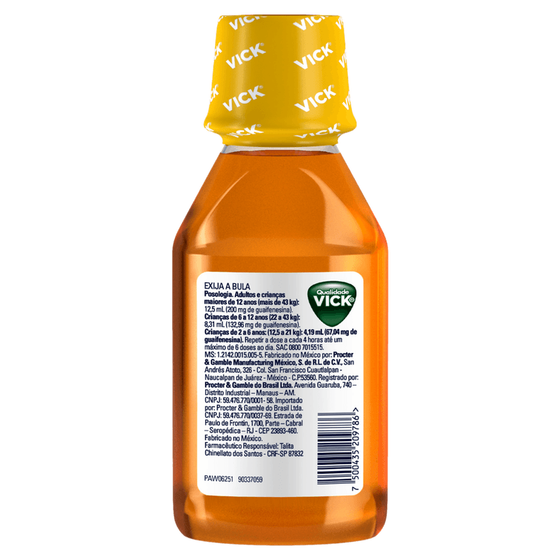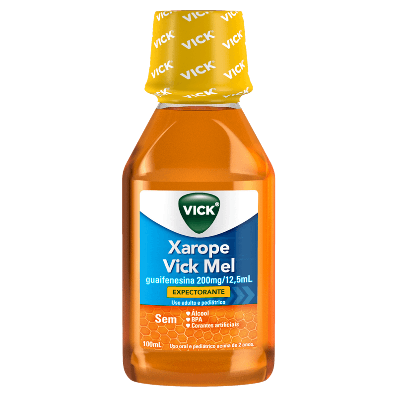 O Xarope Vick Mel é um expectorante eficaz indicado para o alívio da tosse produtiva com catarro, comum em gripes e resfriados. Sua fórmula contém guaifenesina 200 mg por 12,5 mL, que ajuda a fluidificar e eliminar o muco das vias respiratórias, facilitando a expulsão do catarro e proporcionando alívio rápido, em cerca de 15 minutos. Livre de álcool e corantes artificiais, é uma opção segura para adultos e crianças a partir de 2 anos, com dosagens ajustadas conforme a faixa etária.