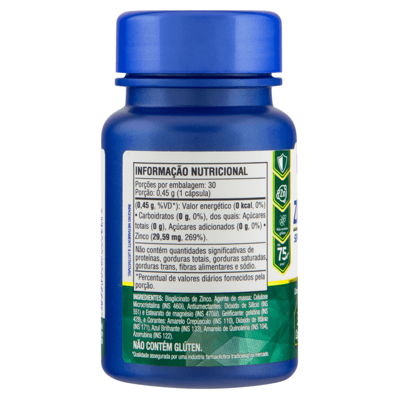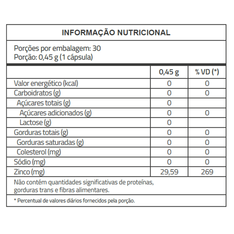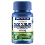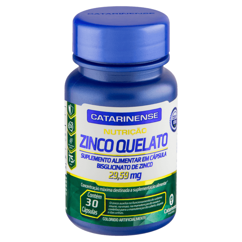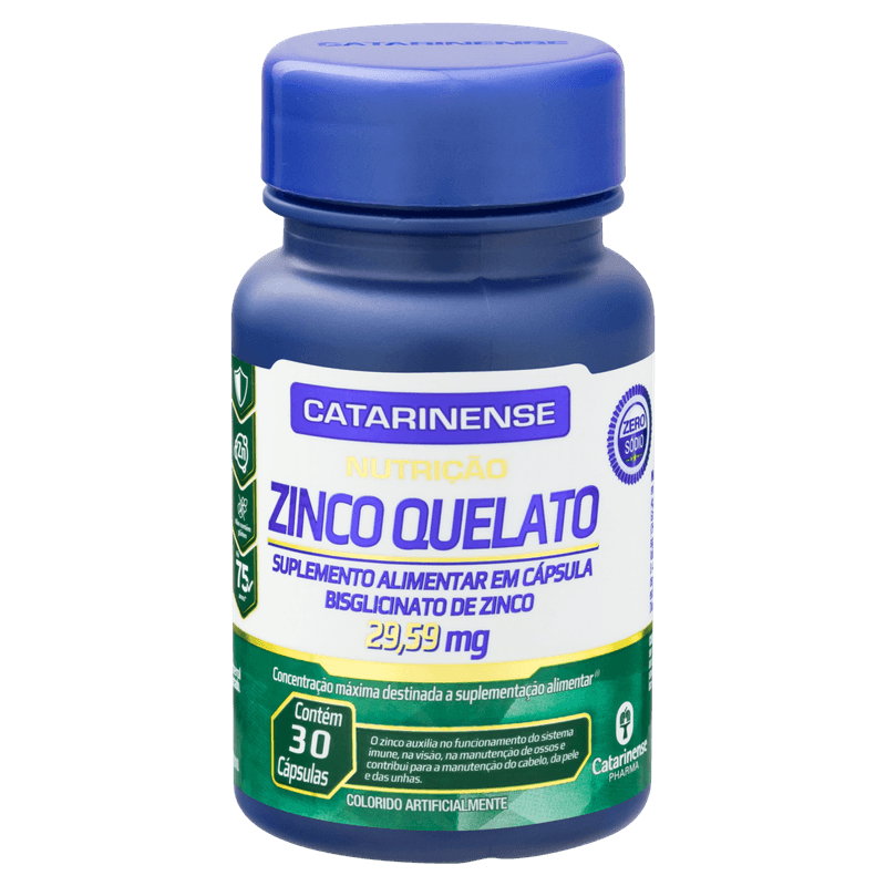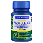 Cada embalagem contém 30 cápsulas sem sabor especificado, apresentadas em formato oral, sem lactose, açúcares ou sódio. O Zinco Quelato Catarinense Nutrição é indicado para adultos que buscam suporte nutricional para o sistema imunológico e saúde da pele, com ação antioxidante e benefícios para o metabolismo e a saúde óssea. Produto sem tarja, não requer prescrição médica e deve ser armazenado conforme as instruções da embalagem. Este produto não é um medicamento. Não exceder a dose recomendada. Manter fora do alcance de crianças.